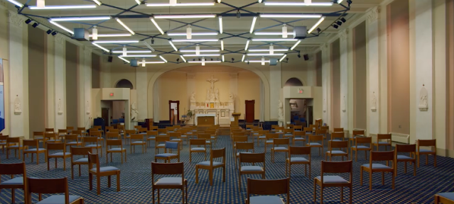 First off, let's state the obvious. The doorway additions have been removed, thereby restoring the side altar niches. The chairs have been replaced by pews and the lighting has been replaced by skylights and a more traditional style of chandelier lighting. However, what is most impressive is the addition of architectural elements to the walls and ceiling, making the chapel seems much less 'boxy' than before and also much more visually interesting and beautiful. As well, the addition of some colour and stencilling has been added to the apsidal wall of the sanctuary which significantly helps to highlight the historic high altar and sanctuary, thereby properly focusing one's attention.