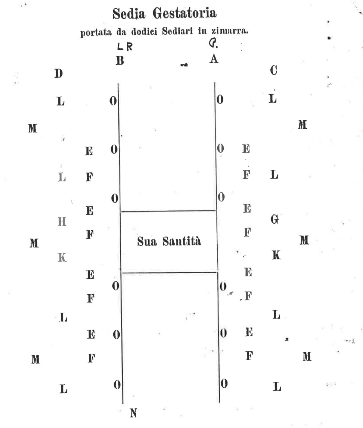 The order of procession was relegated according to the Sacra Congregazione Ceremoniale, seen in the document below. The extra sediari walked at the front of the procession, just behind the Sargent of the Pontifical Swiss Guard. Then the 12 sediari would carry the sedia gestatoria, indicated in the second image below with the series of letter "O's." Click here for more information on the order of procession.